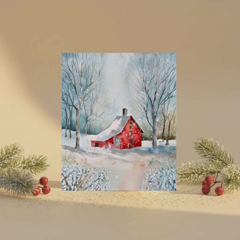 Kalėdinis atvirukas „Raudonas namelis “ – jaukus būdas pradžiuginti artimą žmogų šventiniu laikotarpiu. Akvarele įkvėpta iliustracija vaizduoja sniegu apsnigtą raudoną namelį, ramiai stovintį žiemos miške.
