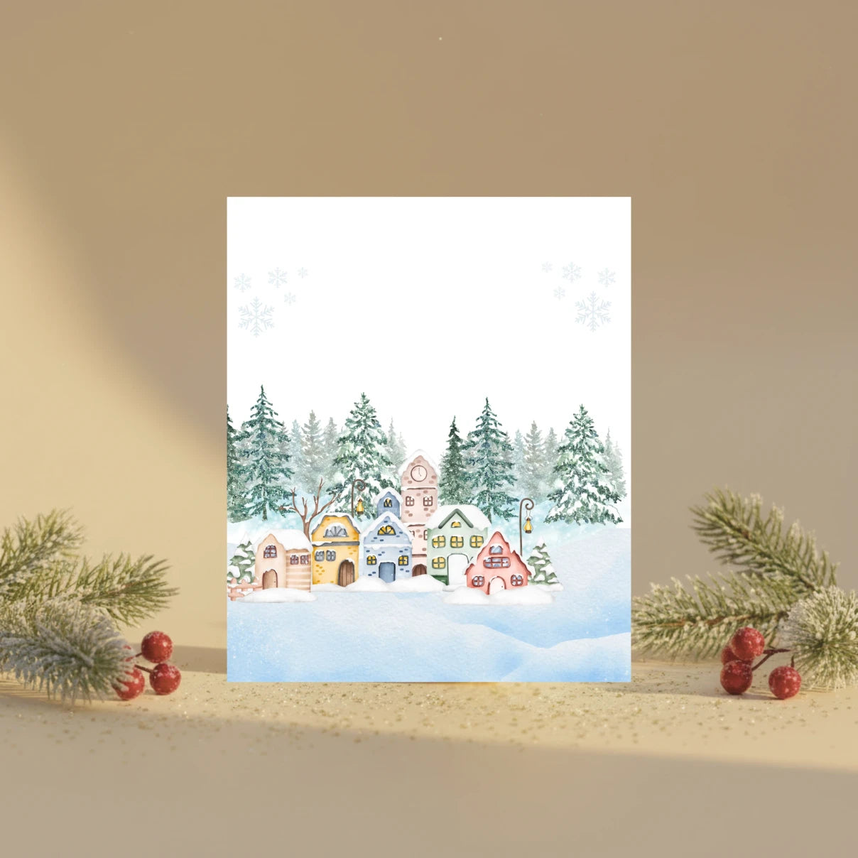 Kalėdinis atvirukas „Spalvotas žiemos miestelis“ – šviesus ir žaismingas šventinis pasirinkimas.