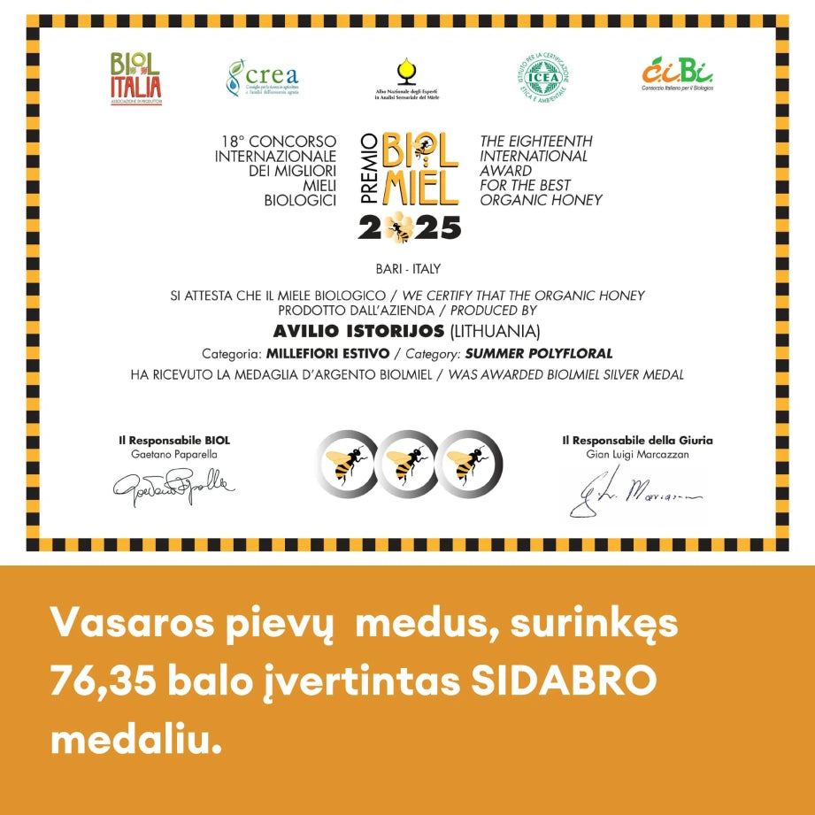 Vasaros pievų medus, surinkęs 76,35 balo, BIOLMIEL 2025 konkurse buvo įvertintas sidabro medaliu. Poliflorinis (daugiažiedis) medus laikomas viena sudėtingiausių kategorijų, nes juose nėra vieno dominuojančio augalo, todėl vertinama harmonija, balansas ir aiški sezono išraiška.
