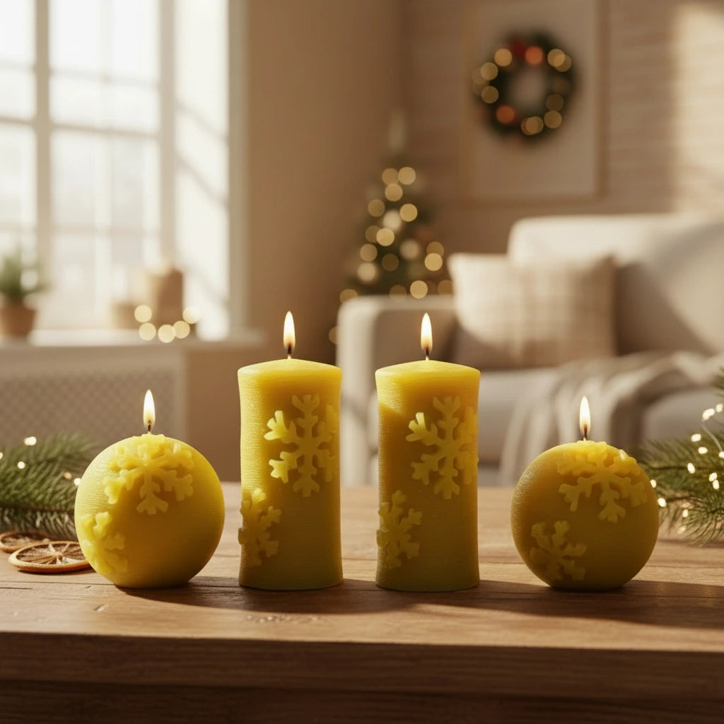 Pagaminta iš 100% natūralaus bičių vaško, papuošta išraižytomis snaigėmis. Degant žvakei, namuose pasklis švelnus medaus aromatas, sukuriantis jaukią atmosferą.
